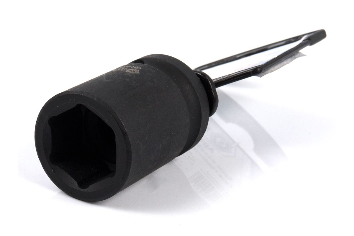 Изготовлена из хроммолибденовой стали, которая обеспечивает наивысшую прочность при работе с экстремальным, жестким, крутящим моментом развиваемым ударными гайковертами. Специальная форма профиля головки предохраняет от срыва грани болтов и гаек. Толстая стенка головки предохраняет ее от разрушения при достижении пиковых нагрузок. Головка имеет отверстие для жесткой фиксации на шпинделе гайковерта.