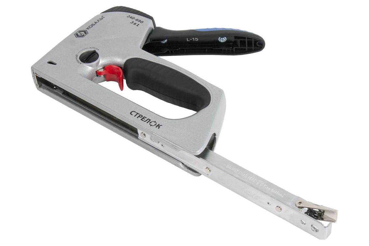 Для облегчения веса, корпус степлера выполнен из алюминия. Работает как со скобами, так и с гвоздями и шпильками.