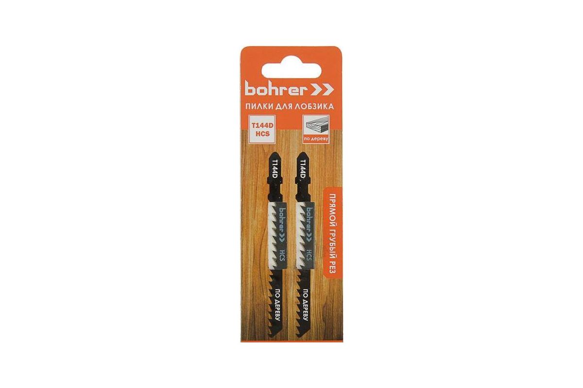 Пилки Т144D бренда Bohrer оснащены Т-образным хвостовиком и подходят для электролобзиков различных марок бытового и профессионального класса. Они без труда вставляются в патрон инструмента и надежно фиксируются, исключая выпадение. Оснастка применяется для прямого реза по заготовкам из древесины твердых и мягких пород, а также деревосодержащих материалов (ДСП, ДВП). Изделие быстро и эффективно осуществляет грубый черновой распил. За счет этого оно будет уместно там, где важна скорость, а не качество среза, например, при демонтаже деревянных конструкций. Крупные заостренные зубья с шагом 4 мм способствуют высокой производительности: оснастка справляется с большим объемом работ короткие сроки. Изготовлены полотна из прочной и упругой высокоуглеродистой стали HCS, которая характеризуется устойчивостью к сгибанию. Материал износостойкий, поэтому пилки прослужат длительное время без потери функционала. В упаковке предусмотрено два лезвия.